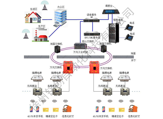 矿用无线通信系统由综合语音服务器、录音服务器、4G/5G核心网系统、上网行为管理系统、触摸屏调度台、地面无线基站、矿用本安型基站、矿用本安型手机、矿用隔爆兼本质安全型电源、光缆等组成。基于VOLTE的高清音视频通话与传输技术,可进行可视通话、视频回传和视频推送等业务,为矿井提供语音通信、数据传输、多系统融合调度、可视化调度等多种应用功能。具备WIFI覆盖、精确定位、运输管理、设备管理等多种应用扩展,真正实现万物互联。