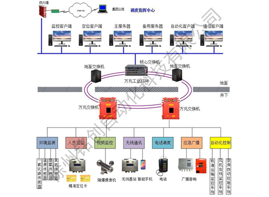 金属非金属矿山综合监控管理系统是针对我国非煤矿山现状而开发的一套软、硬件结合的全矿井生产综合监控系统。可对矿山井下环境、人员定位、电话调度、广播通讯、无线通讯(WIFI、4G)、视频监控、机车运输监控、风机在线监测等参数进行综合监控管理。井下通过冗余工业以太环网,利用多功能监测基站,结合总线等传输方式将井下各种子监控系统合理地融合为一体,在方便管理维护的基础上大大节约了投资成本。